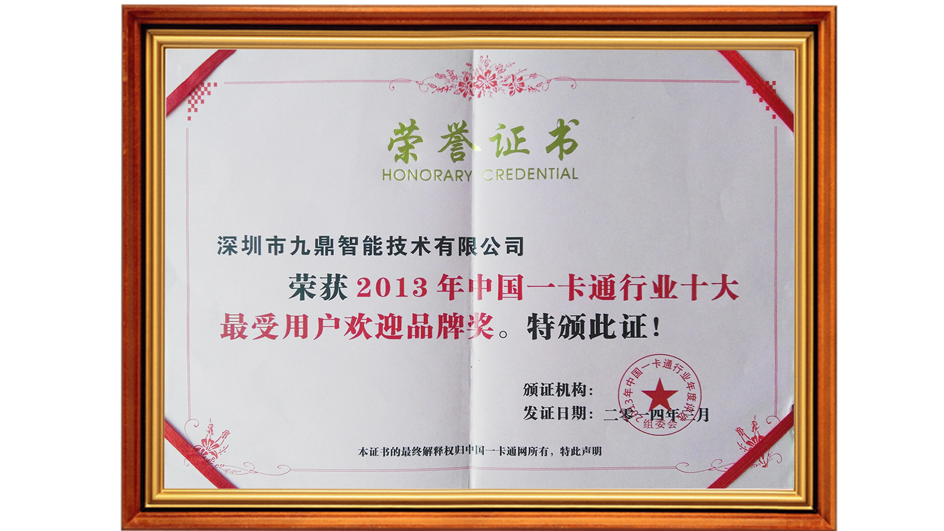 2013年中國一卡通行業十大最受用戶歡迎品牌獎