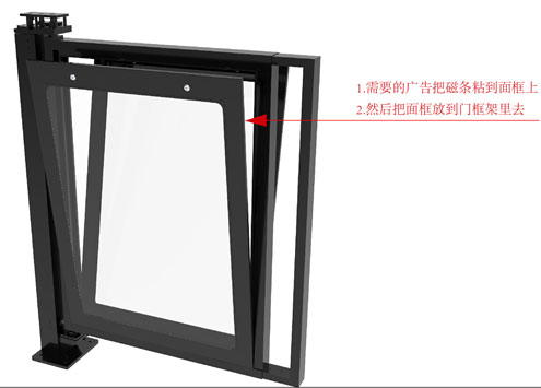 4、上廣告固定面框,把需要的廣告用磁條粘到面框上,然后把面框放到門框架里。
