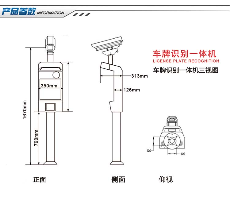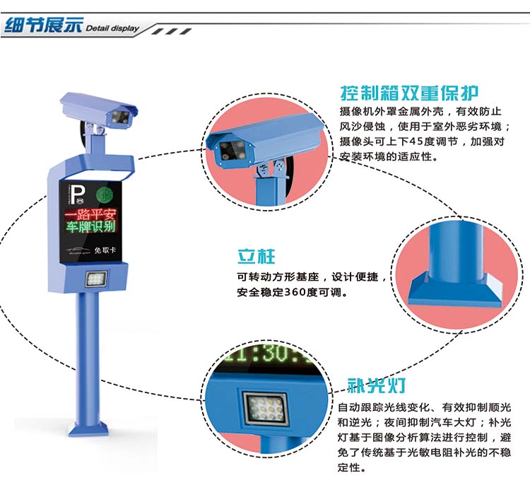 5、產品高度集成:產品集成了車牌識別高清相機、鏡頭、防護罩、立柱、補光燈、萬向節、電源等設備,屬于高度集成的一體化硬件車牌識別設備。