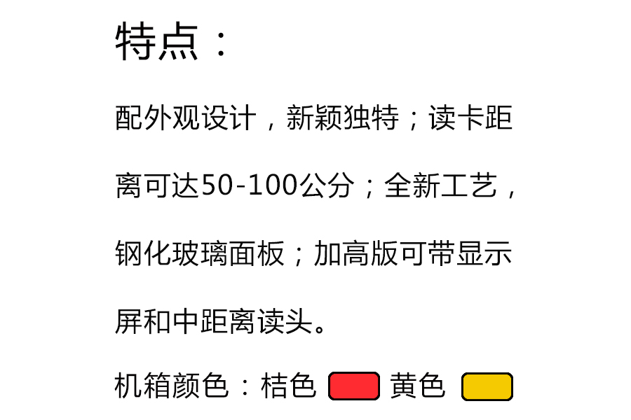 全新工藝,鋼化玻璃面板,讀卡距離可達50-100公分,加高版可帶顯示屏和中距離讀頭。